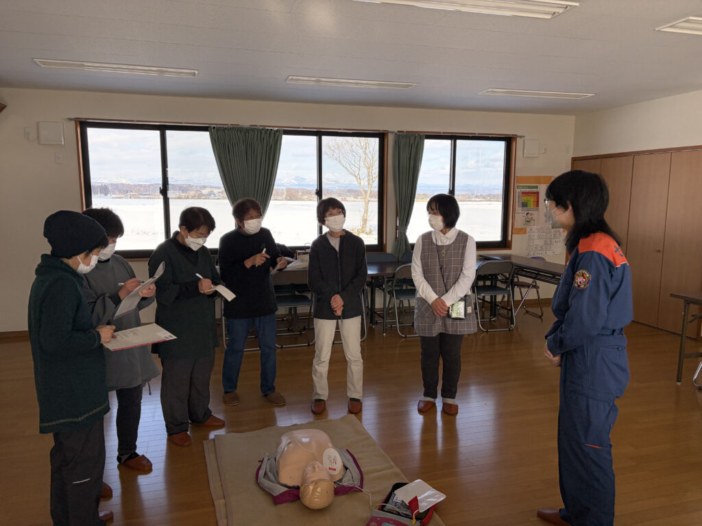 講習では倒れている人を発見した際の初動対応を中心に学びました。参加者はメモを取りながら、実際の場面を想定した手順確認にも熱心に取り組んでいました。