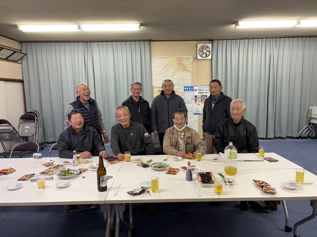 志津壮年会は、約40年前から続く志津地区の長年の交流会です。現在のメンバーは13名で、この日は8名が参加しました。毎月5日の夜に志津地区センターへ集まり、お茶やお酒を囲みながら近況や昔の思い出、健康のことなどを気軽に語り合っています。最近は病気や血圧、薬の話題が増えており、互いの体調を気遣いながら過ごす大切な時間にもなっています。