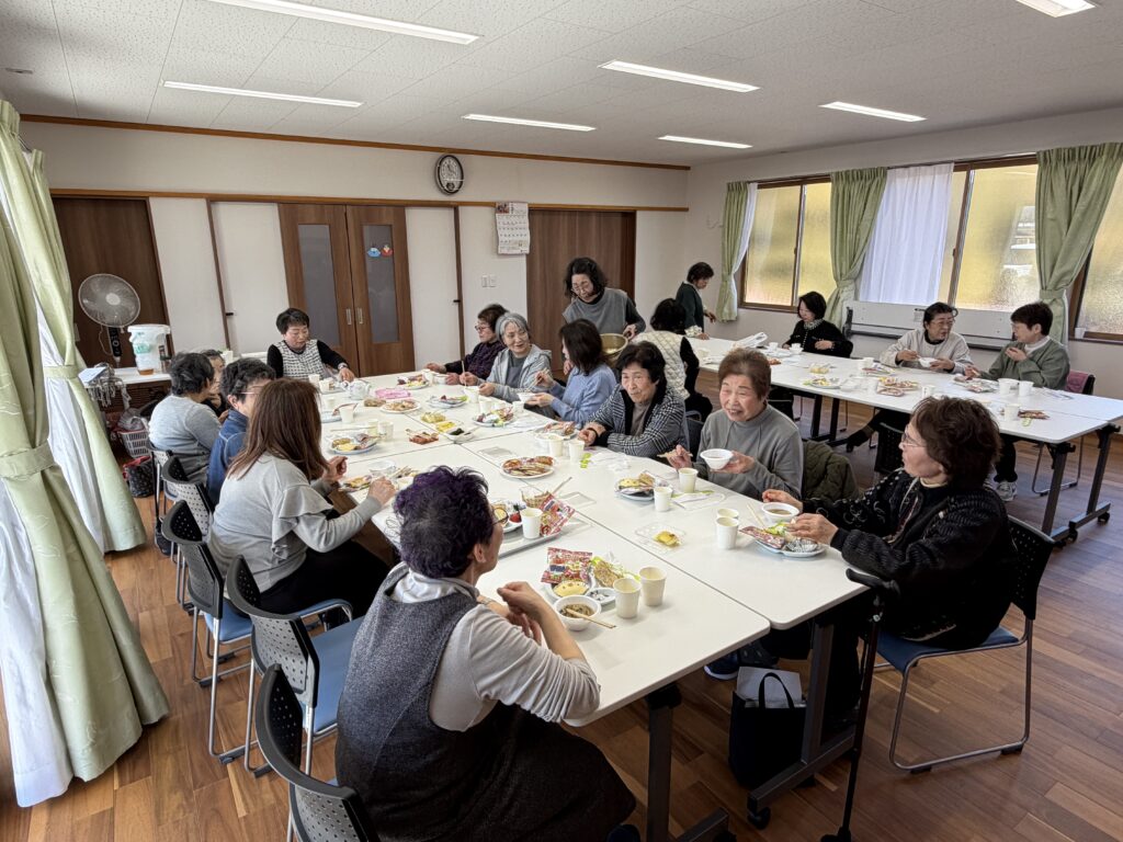 演奏会の後はお茶のみ会が開催され、テーブルには参加者が持ち寄ったお手製の漬物や温かい汁物、蒸しケーキなど、心のこもった料理が並びました。