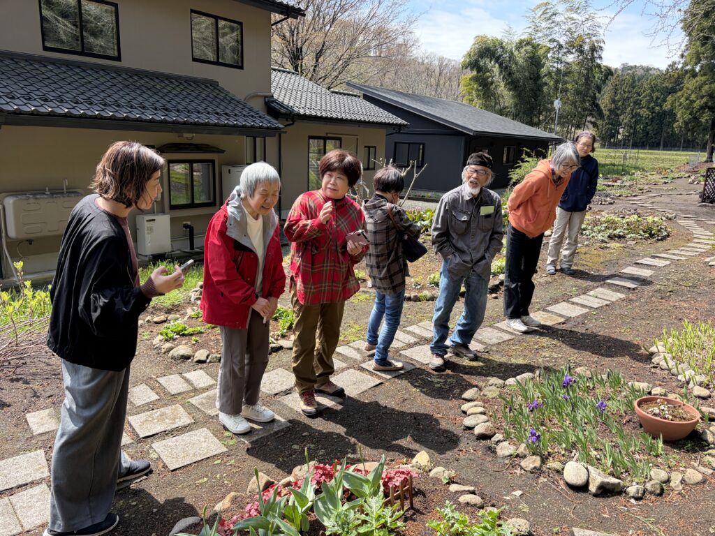 お花見では、メンバーの方が庭に咲く草木や花を紹介していました。参加者からは「いろいろな種類のお花や木があって素敵なお庭」「雨上がりでお花や葉っぱがキラキラして良い時に来たね」と話しながら、自然の美しさをゆっくり味わう時間となっていました。